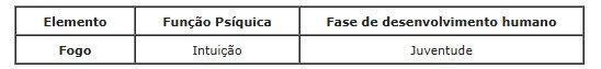 O elemento Fogo corresponde à força criativa. Ele é a vida, o espírito que preenche a estrutura física formada pelo elemento Terra. Sem a vida do Fogo, toda a estrutura do elemento Terra torna-se um mero objeto inanimado. Psicologicamente, esse impulso vital traduz-se pela intuição, a função psíquica que se caracteriza pela