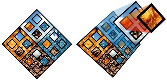 O diagrama acima resume, em forma de imagem, os princípios que acabei de expor. No lado esquerdo temos o diagrama dos elementos, contendo em si seus aspectos quaternários; no lado direito vemos, como exemplo, o elemento Ar em destaque e, ressaltando dele, o seu aspecto Fogo – em outras palavras, Fogo de Ar, a configuração elemental correspondente ao Cavaleiro de Espadas.